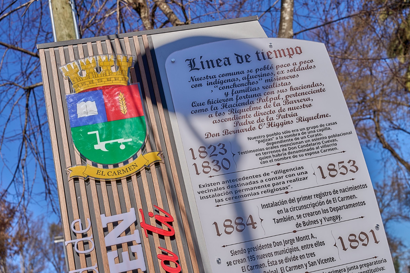 El Carmen inauguró un monumento de la línea del tiempo de su historia, instancia enmarcada dentro del calendario de actividades de aniversario de la comuna, el cual está emplazado en la Plaza de Armas por calle Baquedano, y que está disponible para toda la comunidad carmelina.