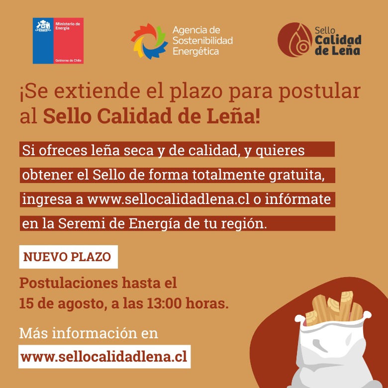 La convocatoria al reconocimiento se amplió hasta las 13 horas del próximo viernes 15 de agosto, a través de www.sellocalidadlena.cl/. El Ministerio de Energía y la Agencia de Sostenibilidad Energética (Agencia SE) ampliaron el plazo de la convocatoria 2025 al “Sello Calidad de Leña”, reconocimiento que busca destacar a las y los comercializadores que cumplan la normativa tributaria y forestal, mediante un proceso de producción que les permita disponer de leña seca y bajo las dimensiones estandarizadas. Por tanto, el “Sello Calidad de Leña” otorga un valor agregado a la producción local de leña que genere un energético de calidad para las y los consumidores de Ñuble. Además, el sello permite a las y los productores de leña ingresar al registro de oficial de la Agencia SE, donde las y los consumidores pueden conocer las producciones de leña seca en el país. Y, a su vez, esto permite estar preparados cuando entre en vigor la Ley de Biocombustibles Sólidos (Ley N° 21.499). Desde la Seremi de Energía de Ñuble, se invita a que más productores y productoras de leña postulen para certificarse a través del “Sello de Calidad de Leña”, “puesto que este logo distingue a los comerciantes que voluntariamente postulen, asegurando que su producto posee una humedad inferior al 25% y que cumple con todas las regulaciones, como un apropiado plan de manejo” resaltó el seremi, Dennis Rivas Oviedo. En cuanto a la importancia de utilizar leña seca, el Seremi Rivas Oviedo agregó que “la leña seca es la que rinde y realmente nos entrega el calor necesario, puesto que contiene una humedad inferior al 25%, a su vez, genera