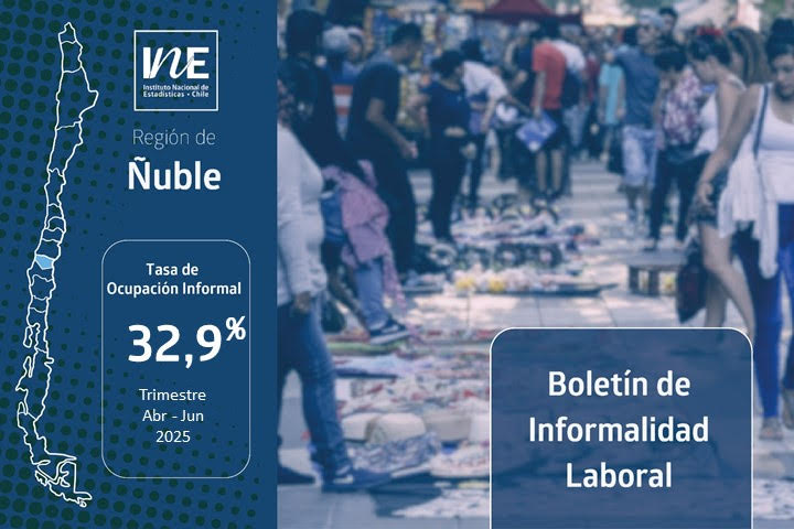 La tasa de ocupación informal en la Región de Ñuble durante el trimestre abril- junio de 2025 se ubicó en 32,9%, decreciendo 1,3 puntos porcentuales (pp.) en doce meses. Esto, de acuerdo con la información registrada en el último Boletín de Informalidad Laboral, difundido por el Instituto Nacional de Estadísticas (INE).