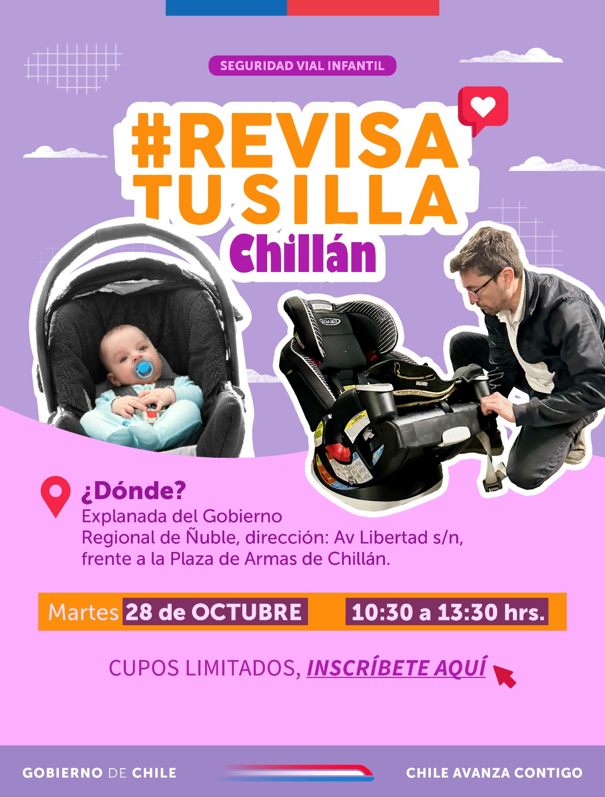 Chillán, 22 de octubre de 2025. La Explanada del Gobierno Regional será el punto de encuentro para la actividad del Programa “Revisa Tu Silla” que permitirá que cerca de un centenar de familias revisen que las sillas y alzadores de sus vehículos estén correctamente instalados y aprendan a utilizarlos de manera segura.