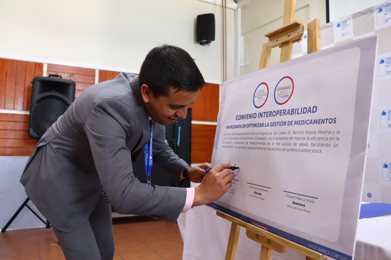 El Director del Hospital de San Carlos, Luis Gatica Pinilla, expresó que “hemos firmado un convenio que va a contribuir al uso eficiente y la gestión local de los fármacos que tenemos en el Hospital de San Carlos. Inyectar tecnología a procesos clínicos administrativos, va a permitir una mejor gestión y optimización de los recursos de nuestro recinto”. Entre los principales beneficios del sistema se encuentra la disminución de quiebres de stock y sobre-stock, la reducción de medicamentos vencidos o próximos a vencer, el mejor uso del espacio en bodegas, menor carga administrativa por registros manuales y la toma de decisiones basada en datos en tiempo real. Hasta la fecha, 56 hospitales del país han firmado convenios de interoperabilidad y 17 ya están intercambiando información en línea con Cenabast, consolidando una red tecnológica que fortalece la gestión pública de medicamentos.
