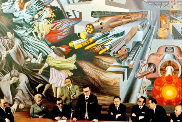 Su obra “Principio y Fin” es una de las expresiones más lúcidas de su mirada. Con un trazo que bordea el impresionismo, Escámez retrata trabajadores, símbolos de solidaridad y ecos de la Guerra Fría, mostrando un país que buscaba sentido en medio de cambios profundos. Su mural habla de comienzos, finales y ciclos históricos que hoy siguen resonando.