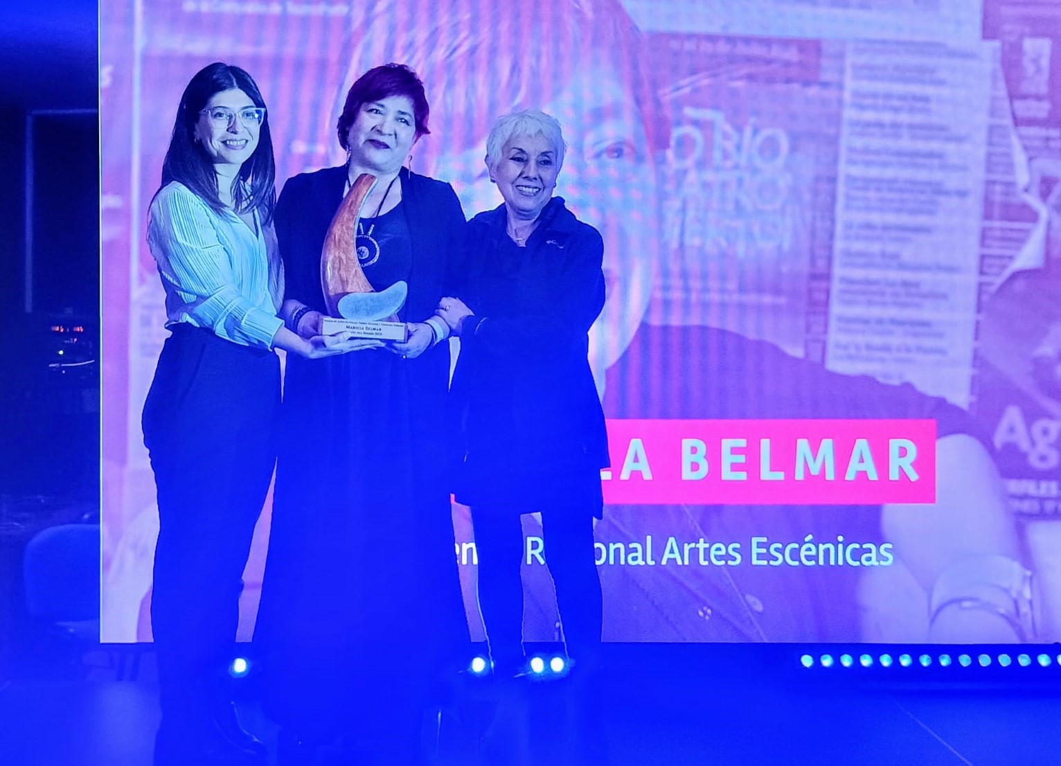 Mariela Belmar, premiada por su trayectoria en las artes escénicas desde Los Ángeles, provincia de Biobío, emocionó al público al señalar que “este premio no es solo para mí, es para todos y todas las que resistimos desde las provincias, donde el acceso a la cultura aún es un desafío. Esto nos visibiliza y nos impulsa a seguir formando públicos. Este reconocimiento abre una pequeña puerta, una ventana también, a que se vea y se muestre el trabajo y el aporte de las provincias”.