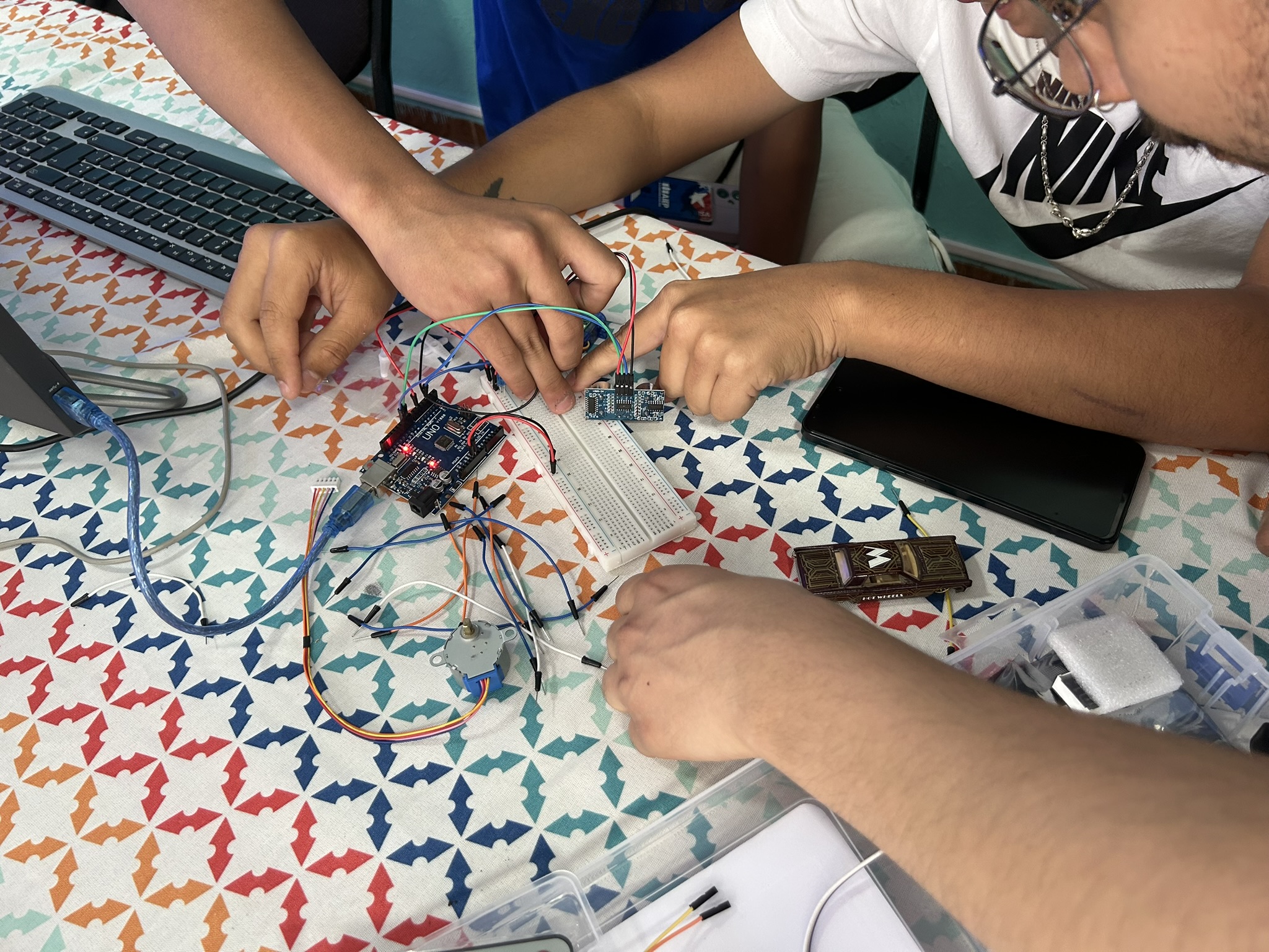 social de la región de Ñuble. El taller a cargo de los estudiantes de Pedagogía General Básica de la Universidad del Bío-Bío, Mario Villarroel y Carlos Sánchez, consideró dos sesiones en las que los jóvenes pudieron construir dos proyectos a través del armado y programación de placas Arduino. Los jóvenes trabajaron en la comprensión de la estructura básica de código, programación de secuencias lumínicas, movimiento preciso de un brazo mecánico, construyendo un radar de seguridad y una barrera vehicular con alarma sonora. “Avanzar en seguridad requiere que -más allá del cumplimiento de la sanción- los jóvenes tengan acceso a nuevas herramientas de educación y capacitación que les permitan modificar sus trayectorias de vida, facilitando sus procesos de reinserción. Este taller les permite acceder a alfabetización digital integrando las ciencias, las tecnologías y las matemáticas; y que entregan nuevas experiencias y aprendizajes, despiertan nuevos intereses en los jóvenes que han infringido la ley”, subrayó el director regional del Servicio de Reinserción Social Juvenil, Felipe Opazo.