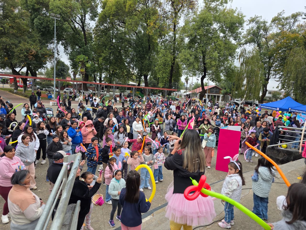 Cientos de niños y niñas de El Carmen llegaron hasta la Plaza de Armas este domingo para disfrutar de una entretenida actividad organizada por la Municipalidad, con el objetivo de festejar la Pascua de Resurrección junto a sus familias y buscar los 6 mil huevitos de chocolate dejados por el “Conejito de Pascua”.