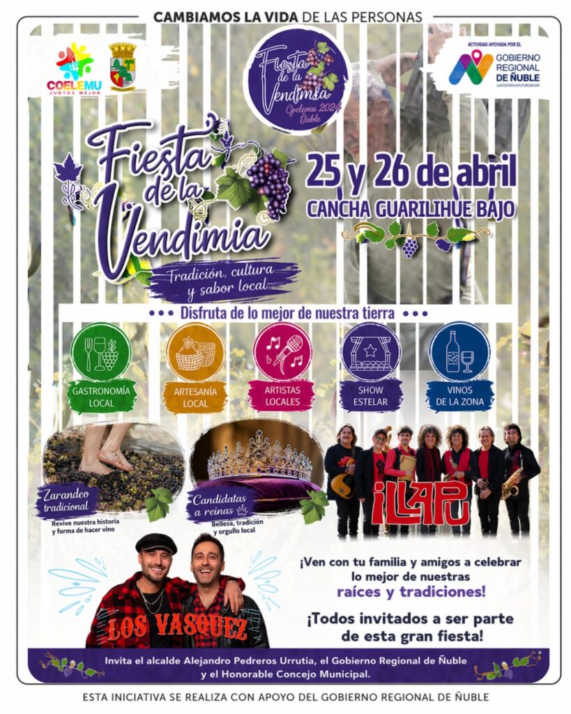 Este sábado 25 y domingo 26 de abril, la comuna de Coelemu se viste de fiesta para celebrar una nueva versión de la tradicional Fiesta de la Vendimia, evento que se desarrollará en la cancha de Guarilihue Bajo y que promete reunir lo mejor de la cultura, el vino y las tradiciones locales.